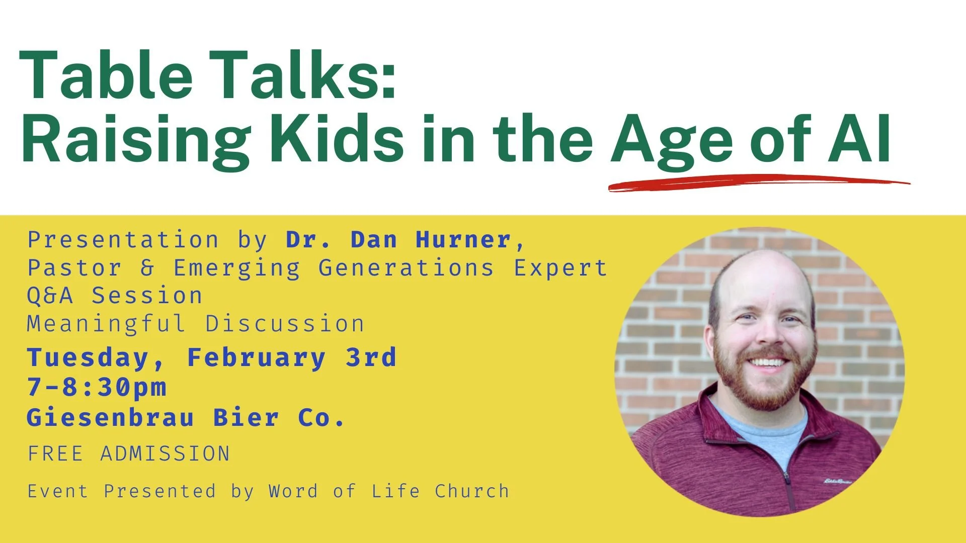 Table Talks: Raising Kids In the Age of AI- AI is shaping how our kids think, learn, and see the world. Join us for an important talk on parenting and teens in the age of AI, featuring Dr. Dan Hurner, Pastor and Emerging Generations Expert on Tuesday, Feb. 3 at 7pm at Giesenbrau Bier Co. Free Admission.